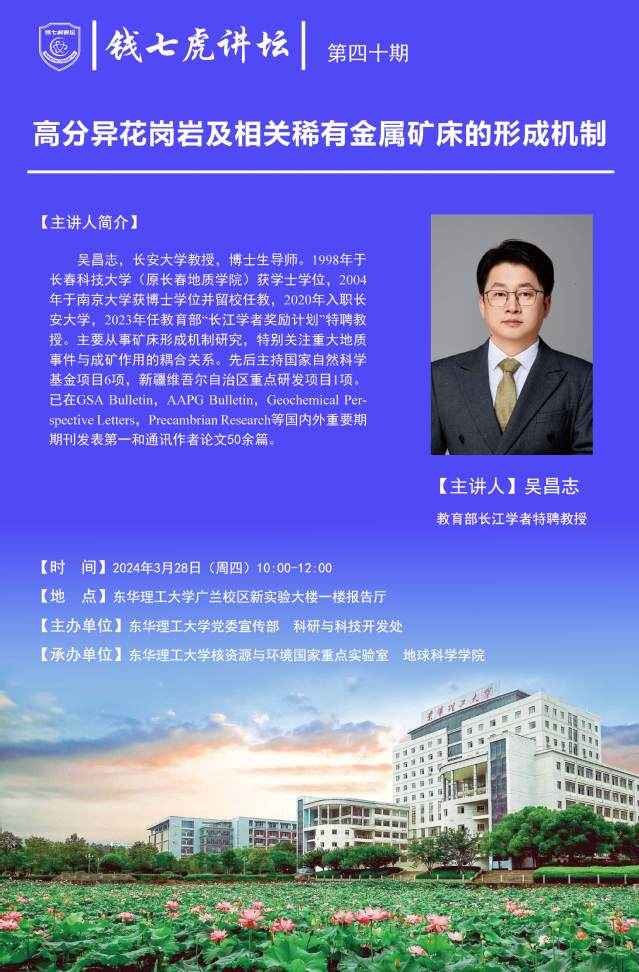 应核资源与环境国家重点实验室、地球科学学院邀请,长安大学教授、博士生导师吴昌志来到“多宝网”,以“高分异花岗岩及相关稀有金属矿床的形成机制”为主题开展讲座。欢迎全校师生届时前往聆听。