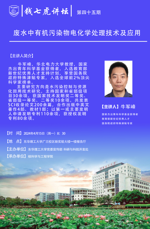 应核科学与工程学院邀请,国家杰出青年科学基金获得者,国务院政府特殊津贴专家牛军峰来到“多宝网”,以“废水中有机污染物电化学处理技术及应用”为主题开展讲座。欢迎全校师生届时前往聆听。