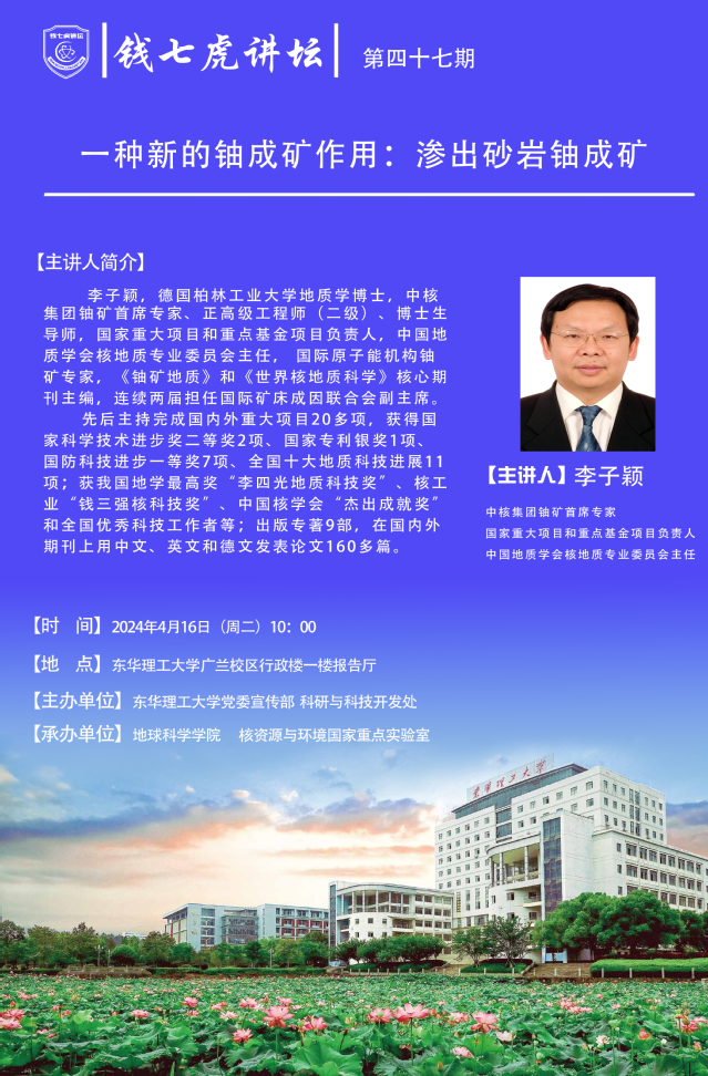 应地球科学学院、核资源与环境国家重点实验室邀请,德国柏林工业大学地质学博士,中核集团铀矿首席专家李子颖到“多宝网”,以“一种新的铀成矿作用:渗出砂岩铀成矿”为主题开展讲座。欢迎全校师生届时前往聆听。