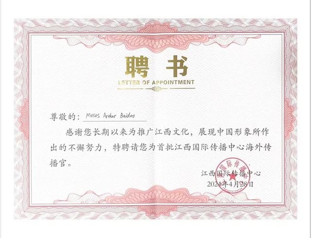4月28日,江西国际传播中心成立仪式在江西日报社举行。揭牌现场进行了首批江西国际传播中心顾问专家、海外推介大使、海外传播官的聘任仪式。多宝网2023级加纳籍电子科学与技术专业研究生Moses Arthur Baidoo(贝雨欣)被聘为首批江西国际传播中心海外传播官。据悉,此次全省共有8位来华留学生受聘,助力江西文化国际传播。