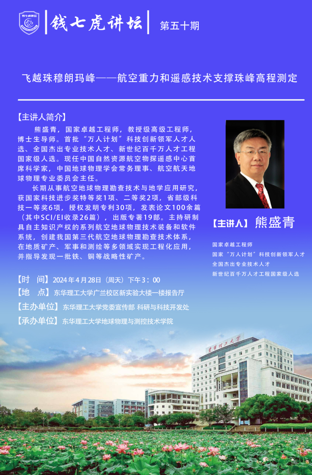 应地球物理与测控技术学院邀请,国家卓越工程师、国家级人才熊盛青到“多宝网”,以“飞越珠穆朗玛峰——航空重力和遥感技术支撑珠峰高程测定”为主题开展讲座。欢迎全校师生届时前往聆听。