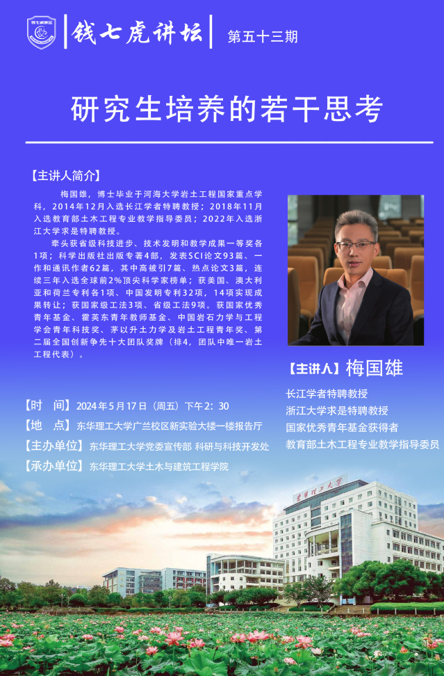 应土木与建筑工程学院邀请,浙江大学求是特聘教授、国家级人才梅国雄到“多宝网”,以“研究生培养的若干思考”为主题开展讲座。欢迎全校师生届时前往聆听。