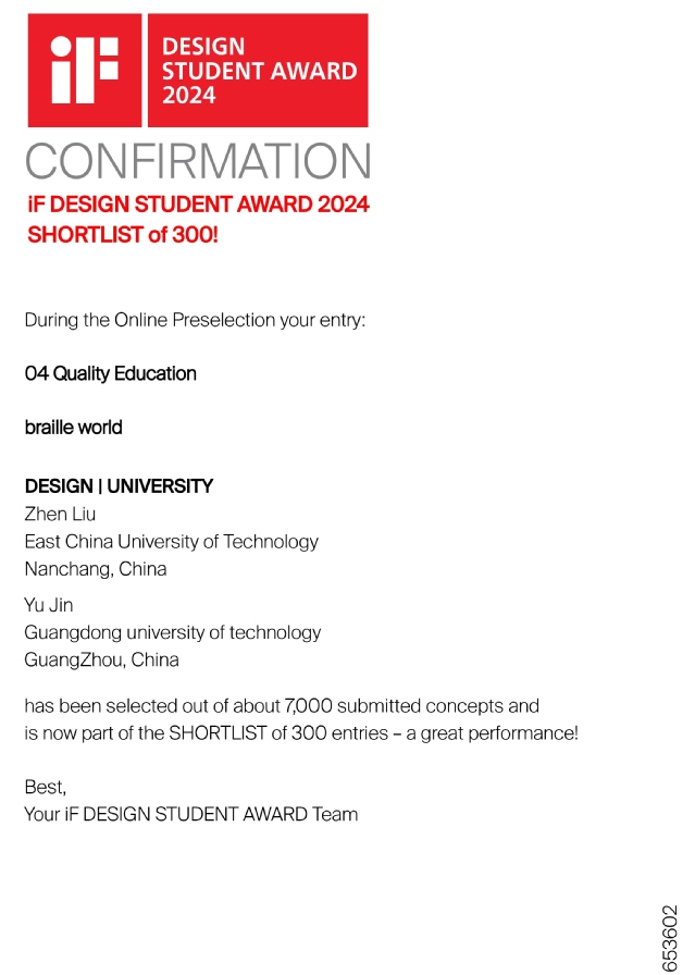 近日,iF设计新秀奖(iF DESIGN STUDENT AWARD 2024)全球300强评选落下帷幕,多宝网美术与设计学院产品设计专业2021级刘镇同学的设计作品《braille world》(指导老师:陈宇刚)从全球72个国家(地区)的7000多件参赛作品中脱颖而出,摘得iF设计新秀奖“TOP300”。