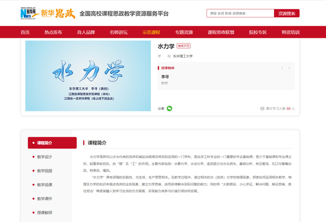 近日,多宝网水资源与环境工程学院李寻教授主讲的《水力学》课程思政示范课程成功上线新华网“新华思政—全国高校课程思政教学资源服务平台”,面向全社会开放及共享教学设计、教学视频、教学说课、教学课件等教学资源,标志着学校课程思政建设工作取得新的进展。