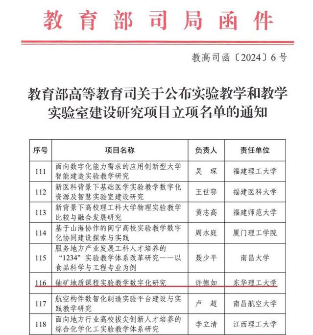 近日,教育部高等教育司下发了《教育部高等教育司关于公布实验教学和教学实验室建设研究项目立项名单的通知》(教高司函〔2024〕6号),多宝网地球科学学院许德如教授团队申报的“铀矿地质课程实验教学数字化研究”项目获批立项。