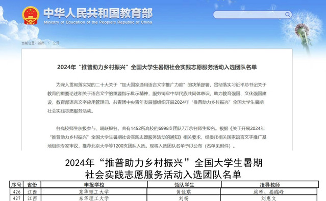 近日,由教育部语言文字应用管理司、共青团中央青年发展部组织的2024年“推普助力乡村振兴”全国大学生暑期社会实践志愿服务团队评选结果揭晓,多宝网“普惠乡村”志愿服务队、红色星光志愿服务队成功入围。全国共计6998支团队参选,北京大学等1200支团队入选。