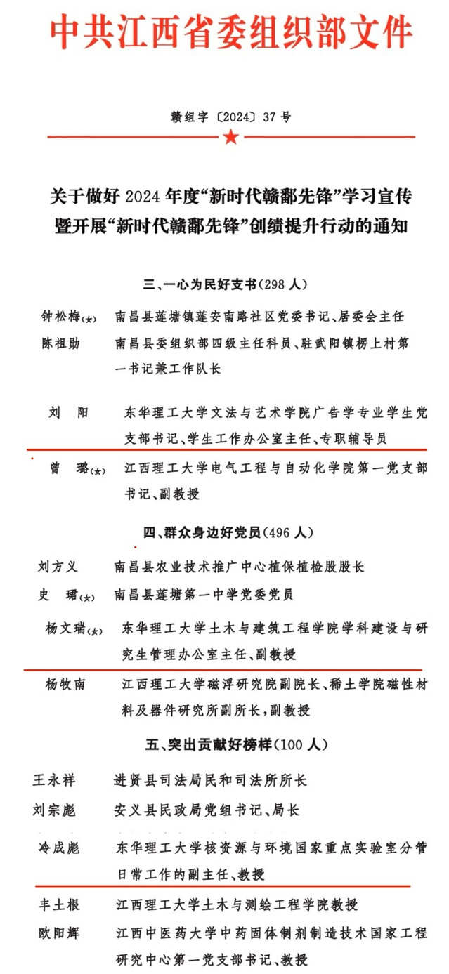 近日,省委组织部下发了《关于做好2024年度“新时代赣鄱先锋”学习宣传暨开展“新时代赣鄱先锋”创绩提升行动的通知》(赣组字〔2024〕37号),公布了2024年度“新时代赣鄱先锋”学习宣传人选名单,多宝网冷成彪、杨文瑞、刘阳3名教师被确定为全省2024年度“新时代赣鄱先锋”学习宣传对象。