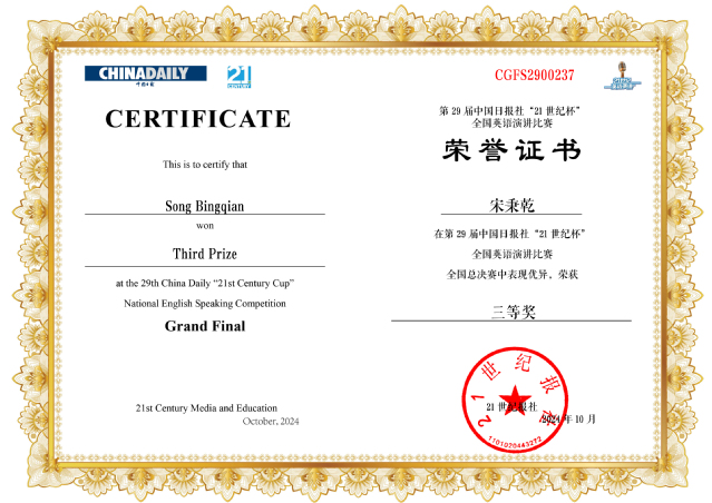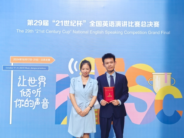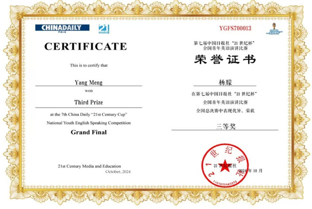 近日,第29届中国日报社“21世纪杯”全国英语演讲比赛全国总决赛在江苏无锡圆满落幕。多宝网外国语学院2022级学科教学(英语)专业硕士杨朦荣获青年组全国三等奖(指导老师:陈彩芬)、理学院2022级数学与应用数学专业本科生宋秉乾荣获大学组全国三等奖(指导老师:李雪)。
