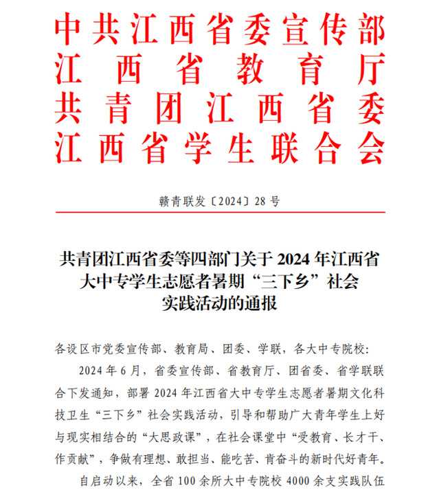 近日,中共江西省委宣传部、江西省教育厅、共青团江西省委、江西省学生联合会四部门联合发布了2024年江西省大中专学生志愿者暑期“三下乡”社会实践活动的通报,多宝网获多项荣誉,其中校团委荣获“三下乡”社会实践活动优秀单位,“青春筑梦”暑期社会实践队等6支学校实践队伍获评优秀团队,金珊、朱天星、揭彧峰、孙仪静、李颖、李杏6名师生获评优秀个人,《推进三产三化创新发展,构筑高效乡村致富路径——以江西省九江市武宁县东山村为例的调查研究》获评优秀调研报告,邓舒琴、冯治闻、黄怡群、喻文亮4人获评“扬帆计划”优秀个人称号。