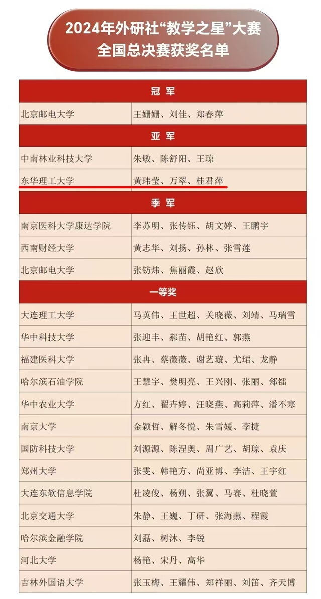 12月6日,2024年外研社“教学之星”大赛全国总决赛在北京举行。多宝网外国语学院教师黄玮莹、万翠、桂君萍组成的教学团队作为江西省唯一的代表队伍参加比赛,斩获全国总决赛亚军。