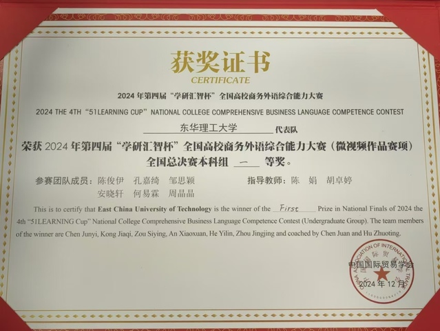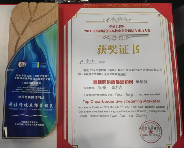 12月7日,2024年“学研汇智杯”全国商务外语综合能力大赛全国总决赛在湖南大学圆满落幕。多宝网外国语学院学生孔嘉绮、安晓轩、邹思颖、周晶晶、陈俊伊、何易霖组成的学生团队(指导老师:陈娟、胡卓婷)以省赛第一的成绩进入全国总决赛,并荣获全国一等奖。陈俊伊荣获最佳跨境直播营销员单项奖。