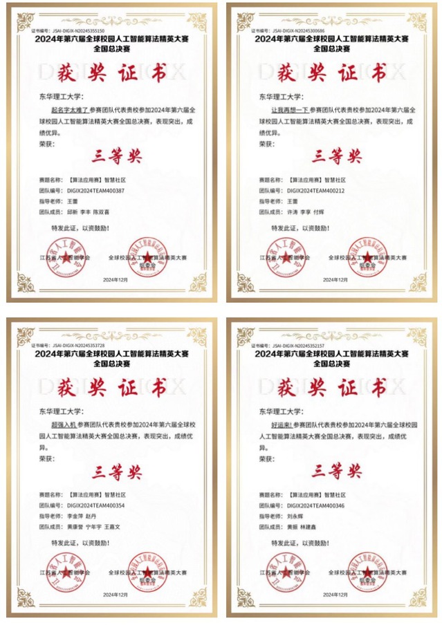 由多宝网吴超、胡瑞、熊晨果组成的学生代表队获“算法创新赛-人工智能+新工科”赛道全国一等奖;刘文博、何景阳、张熙凌组成的学生代表队获“算法挑战赛-AI生成人脸图像鉴别”赛道全国一等奖,创造了学校在该项赛事的历史最好成绩。