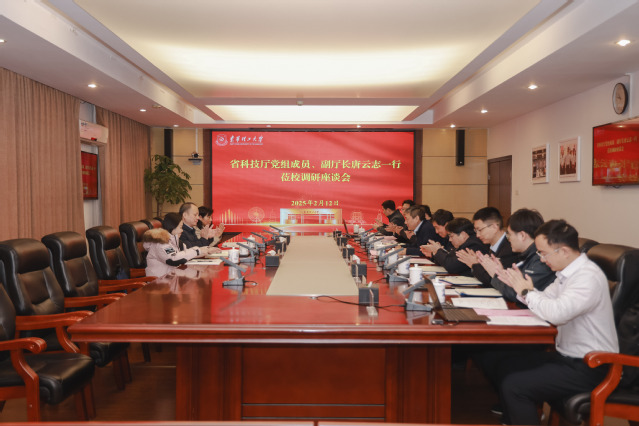 2月12日,省科技厅党组成员、副厅长唐云志一行到多宝网调研,学校召开座谈会,校党委副书记、校长罗仙平出席,校党委常委、副校长邓居智主持。