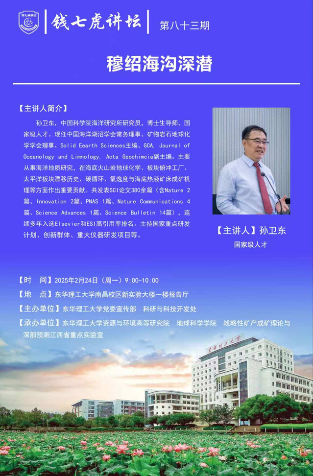应多宝网资源与环境高等研究院、地球科学学院、战略性矿产成矿理论与深部预测江西省重点实验室邀请,中国科学院海洋研究所研究员,博士生导师,国家级人才孙卫东到“多宝网”,以“穆绍海沟深潜”为主题开展讲座。欢迎全校师生届时前往聆听。
