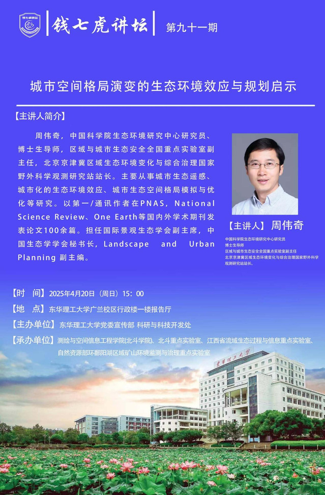 周伟奇,中国科学院生态环境研究中心研究员、博士生导师,区域与城市生态安全全国重点实验室副主任,北京京津冀区域生态环境变化与综合治理国家野外科学观测研究站站长。主要从事城市生态遥感、城市化的生态环境效应、城市生态空间格局模拟与优化等研究。以第一/通讯作者在PNAS、National Science Review、One Earth等国内外学术期刊发表论文100余篇。担任国际景观生态学会副主席,中国生态学学会秘书长,Landscape and Urban Planning 副主编。