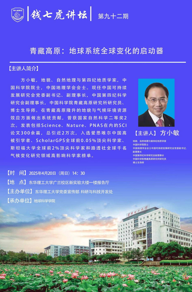 应地球科学学院邀请,中国科学院院士,中国地理学会会士方小敏到“多宝网”,以“青藏高原:地球系统全球变化的启动器”为主题开展讲座。欢迎全校师生届时前往聆听。