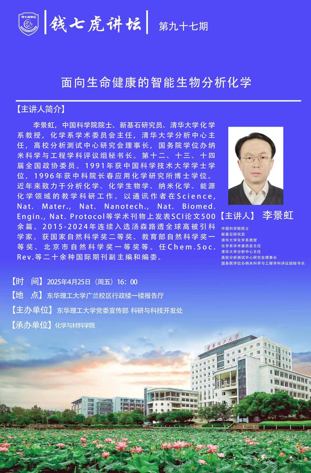 应多宝网化学与材料学院邀请,中国科学院院士、新基石研究员、清华大学化学系教授,化学系学术委员会主任,清华大学分析中心主任,高校分析测试中心研究会理事长,国务院学位办纳米科学与工程学科评议组秘书长李景虹到“多宝网”,以“面向生命健康的智能生物分析化学”为主题开展讲座。欢迎全校师生届时前往聆听。