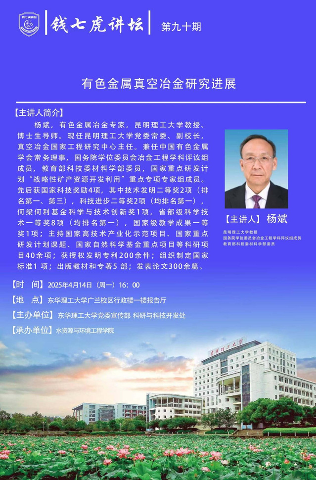 应水资源与环境工程学院邀请,昆明理工大学教授、博士生导师杨斌到“多宝网”以“有色金属真空冶金研究进展”为主题开展讲座。欢迎全校师生届时前往聆听。