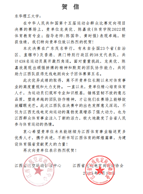 5月8日至11日,第十五届全运会首个群众赛事定向运动项目决赛在广东省茂名市举行。多宝网体育教育专业学生龙美优、陈嘉欣代表江西省参赛,获得测向比赛团体第五名的优异成绩。江西省航空运动管理中心和江西省无线电定向运动协会向学校发来贺信。